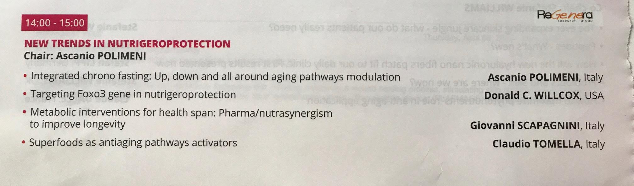 Nella session dedicata al Cronofasting integrato oltre al dott Polimeni,parleranno il prof Craig Wilcoxx gerontologo studioso dei centenari di Okinawa,il prof Gscapagnini ed il dott Claudio Tomella.